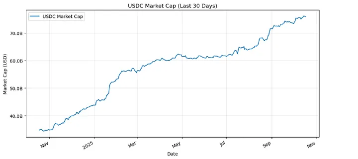 Over the past year, USDC’s market capitalization has shown a steady upward trend, rising from around $40 billion to nearly $70 billion, with notable growth spurts in January and July. This trajectory unfolds within a macroeconomic backdrop shaped by elevated short-term interest rates, money market fund (MMF) expansion, and a post-2023 banking system recalibration.