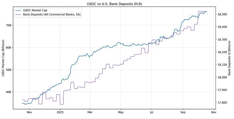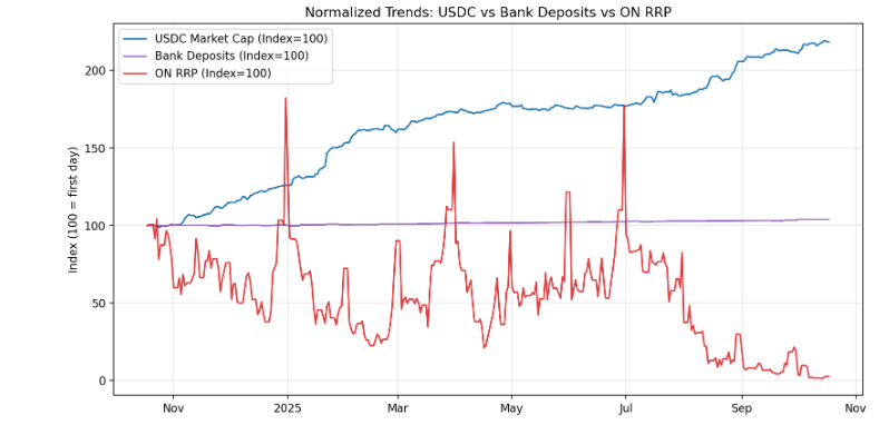 USDC shows a consistent upward trajectory, more than doubling from its baseline, signaling sustained growth in stablecoin adoption. In contrast, bank deposits remain virtually flat, indicating minimal movement in traditional banking liquidity relative to the rapid expansion of USDC.