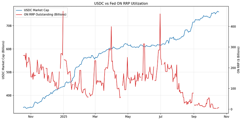 As of October 17, 2025, USDC’s market cap stood at approximately $75.93 billion, while U.S. commercial bank deposits totaled around $18.52T — highlighting the scale of traditional finance versus tokenized dollars. With short-term rates elevated (SOFR at 4.29%, 3-month Treasury yield at 4.03%), the opportunity cost of holding non-yielding stablecoins rises. ON RRP balances at $6.96B reflect institutional liquidity preferences, reinforcing the competitive tension between stablecoins and traditional banking products.